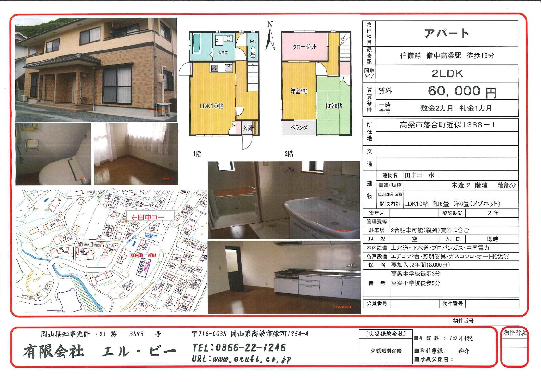 4月初旬入居可能 物件写真 「画像タップ」で拡大表示できます。 間取り 「画像タップ」で拡大表示できます。 物件情報 所在地 高梁市落合町近似1388-1 家賃 60,000円 共益費 なし 敷金 2ヵ月分 礼金 1ヵ月分 更新費 なし 駐車場 2台分を賃料に含む(縦列) 火災保険 要加入(2年間 18,000円) 仲介手数料 66,000円 間取り 2LDK(メゾネット) 構造・階数 木造瓦葺2階建 設備 上水道・下水道・プロパンガス・中国電力・エアコン2台・照明器具・ガスコンロ・オート給湯器 担当 西 お問い合わせ お電話 》0866-22-1246 ※タップで発信 メール》メールで問い合わせ ※タップでお問い合わせフォームへ ピリカハイツC102号室 [家賃55,000円] 令和8年4月中旬~入居可能